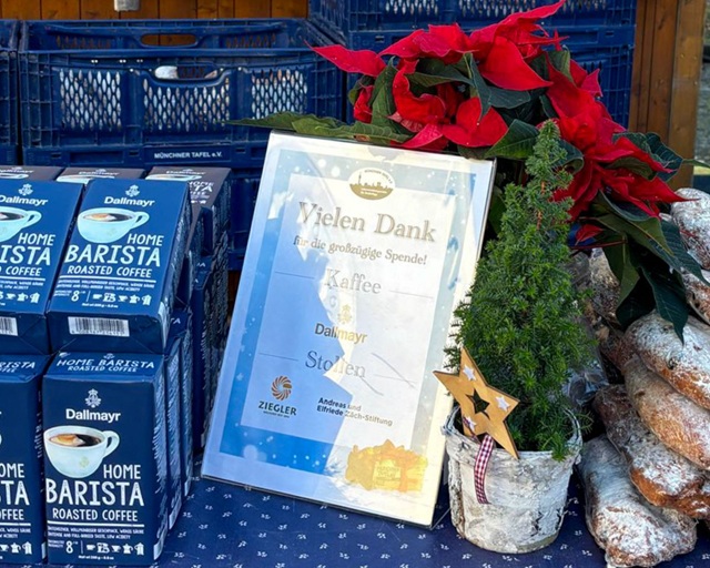 Dieses Jahr unterstützte Dallmayr erneut die Münchner Tafel zur Weihnachtszeit mit einer großzügigen Spende von mehr als 8.000 Packungen Kaffee. Insgesamt wurden 668 Kartons mit jeweils 12 Packungen Dallmayr Home Barista an die gemeinnützige Organisation übergeben. Die Ausgabe der Lebensmittel fand in der ersten und zweiten Dezemberwoche an allen Ausgabestellen der Tafel in München statt. Dort entstanden festlich arrangierte Bereiche mit Dallmayr-Kaffee, Stollen und liebevoll gestalteten Papierschildern, die den weihnachtlichen Rahmen unterstrichen und den Helferinnen und Helfern Anerkennung zollten.