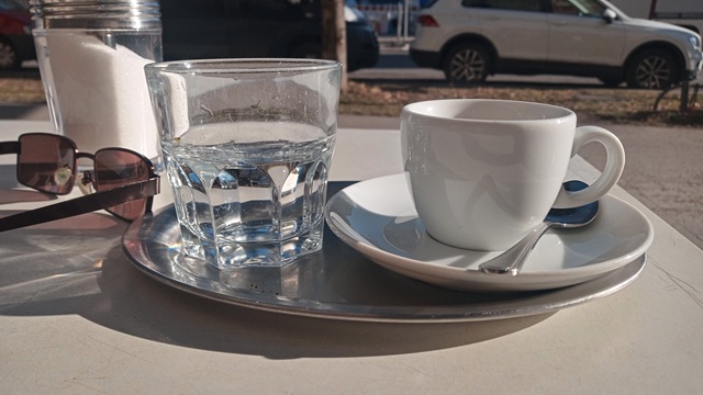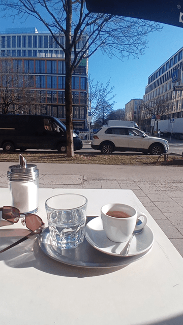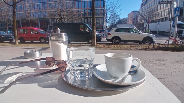 Es sind nur wenige Schritte zur U-Bahn Schwanthaler Höhe und etwas weiter in der anderen Richtung zu mir. Und so kam es, dass ich am vergangenen Montag nicht gleich zur U-Bahn gegangen bin, sondern das kleine Stück zurück ins Café zu gehen um noch einen Espresso in der Sonne zu trinken. Ja, die Wintersonne war so kräftig, dass es auch draußen recht angenehm war, kein T-Shirt-Wetter, das ist klar, aber zum draußen sitzen reicht es.