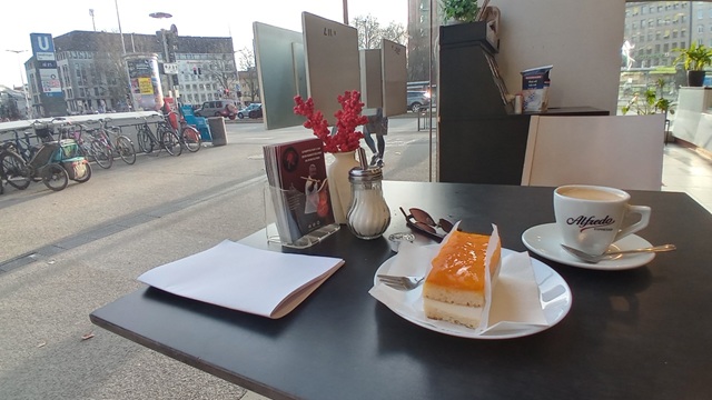 Genau genommen handelt es sich um eine Filiale der „Münchner Backstube“, von denen es insgesamt sechs im Stadtgebiet gibt. Also ein besserer Backshop aber ganz gemütlich eingerichtet. Außerdem mit einem schönen Blick auf den sonnenüberfluteten Sendlinger-Tor-Platz. Die frische Sonne trug ihr Übriges zu meiner guten Laune bei. Und so kam ich endlich zu meinem Stück Kuchen – Mandarinensahne – lecker! Ganz ehrlich gesagt: draußen schmeckt es besser, als in der Klinik!