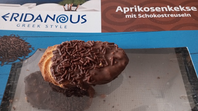 Doch wie authentisch sind diese Kekse? Es gibt sie in Griechenland tatsächlich, weiche Kekse aus Mürbteig mit einer Aprikosenfüllung und einem Topping aus Schokolade und/oder Kokosraspeln. Dort heißen sie Voutimata und es gibt einen griechischen Hersteller – Violanta Cookies aus Karditsa bei Trikala – der sie genauso anbietet, wie bei Lidl. Also tatsächlich ein Stück authentisches Griechenland für daheim.