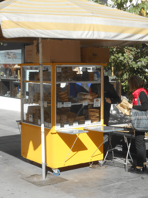 Der Anblick der morgendlichen Stoßzeit mit Menschen jeden Alters, die Becher mit einer Vielzahl von Frappes, Latte oder Saft in einer Hand halten und dabei frische, süß duftende, knusprige Koulouri genießen, ist ein klassischer und sehr wichtiger Teil der griechischen Kultur. Die meisten Koulouri-Stände sind gelb. Woran das liegt konnte ich nicht in Erfahrung bringen. Und sie gehören übrigens auch in Thessaloniki zum Stadtbild. Die Koulouri hat ihre Wurzeln im Byzantinischen Reich und war vor allem mit den Städten Konstantinopel und Thessaloniki verbunden. Tatsächlich bezeichneten Koulouri-Verkäufer in Konstantinopel ihre Ware als „Thessaloniki Koulouri“, ebenso wie Verkäufer in Athen viele Jahre später. Der Name blieb bestehen, und die Thessaloniki Koulouri wurde zu einem ikonischen griechischen Snack.