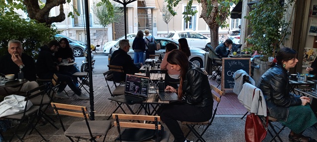 Eigentlich hatte ich einen anderen Plan: auf dem Weg zum Akropolis-Museum wollte ich in einer traditionellen Bäckerei im Stadtteil Koukaki besuchen, die auch in meinem Reiseführer erwähnt wurde. Drei Gründe sprachen dagegen: der Laden war bumsvoll, es gab keine Sitzgelegenheit und keinen Kaffee. Also ging ich notgedrungen weiter durch den Stadtteil an der Akropolis, bis ich an einer kleinen Kreuzung das Little Tree Books & Coffee fand. Hier, an diesem kleinen Platz, verirrten sich sogar noch ein paar Sonnenstrahlen und zu meinem Blick wurde gerade ein Platz frei.